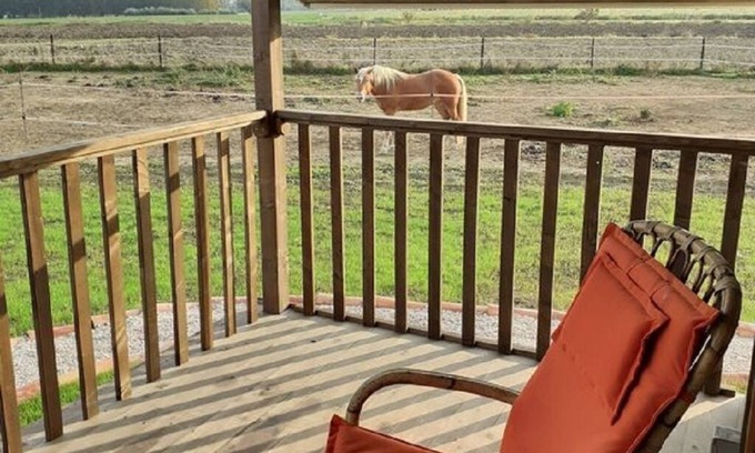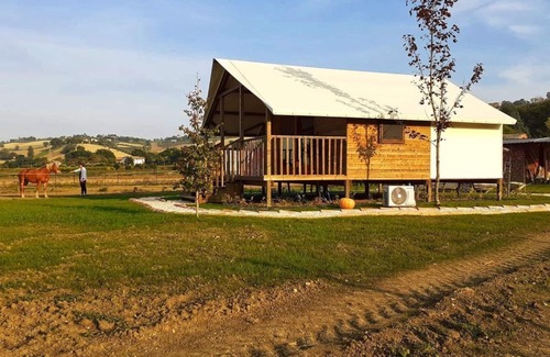 A glamorous tent surrounded by nature where you can spend your vacation. Two comfortable bedrooms, kitchen and bathroom with hydromassage shower are waiting for you. A porch with a rocking chair ideal for reading a book, whose only noise will be that of nature. Wood oven available for your dinners. Zoe will be waiting for you, a young mare with a blonde mane that will keep you company these days away from the city.
