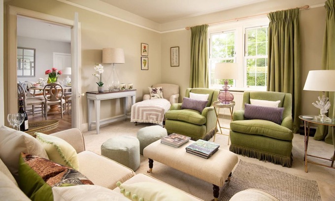 Lane Cottage, the former butler's residence, has benefited from an extensive renovation and now serves as a spacious three-bedroom holiday home. Inspired, perhaps, by the cottage's verdant surroundings, touches of green are found virtually everywhere in this sophisticated property, from the full-length sage green curtains in the fire warmed sitting room and delicate apple green tones of a bedroom to the topiary plants dotted around the open plan kitchen, dining and living area. The large, light-filled kitchen boasts all-new appliances and a lengthy worktop, which doubles up as a breakfast bar. Together with a circular dining table and inviting sofa, this convivial space leads out to the front garden and invariably forms the heart of the home.