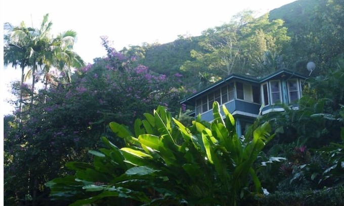 The Lani Oli Hale is built up on a hillside. It is built on pillars over a large outdoor lanai area. It has surround windows with screens and louvers that can be opened to allow optimum airflow from the trade winds.The windows look out over the mountain, valley and jungles. On the lower level of the home.. built onto the back there is an ohana unit. It functions privately and separately from the Lani Ol with its own entrance, living areas, lanai , outdoor shower etc.. The owner (or onsite caretaker if owner is away) lives in this separate Ohana cottage and is available to assist with home and island activity questions or planning. There is onsite laundry services. The owner or caretaker does the laundry for you