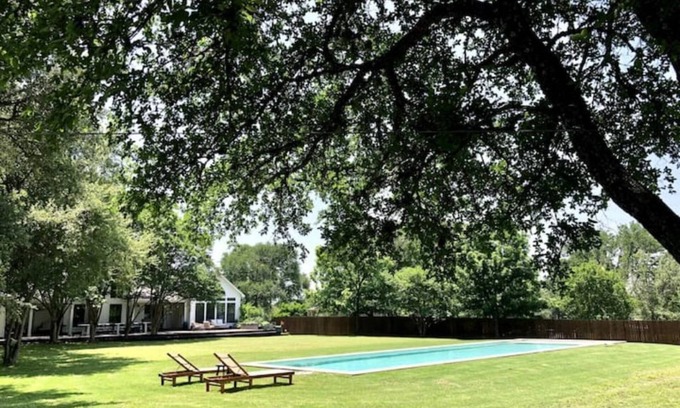 Welcome to this bright, spacious home, designed to be a place you won't want to leave! This cul-de-sac home, located on more than 1 acre features a 55ft lap pool, a 1,500 square foot deck, an outdoor infrared sauna & 4 bedrooms/4 bathrooms (ideal for up to 8 people). Located in south Austin, this retreat-like home is a haven for relaxation. Arrive with everything you need for your stay & you might not leave until it's time to check out! Guests have use of a BBQ grill, fire pit, zip line & more.
