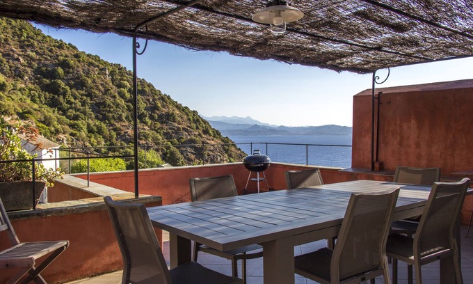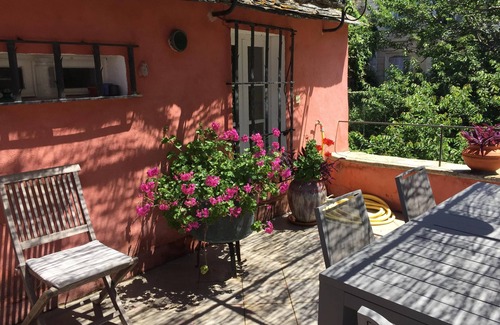 The terrace offers a breathtaking view of the gardens of the house, the former gendarmerie, the mountain, the village, the tower, the sea and further afield the Gulf of St Florent.