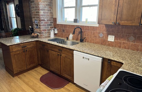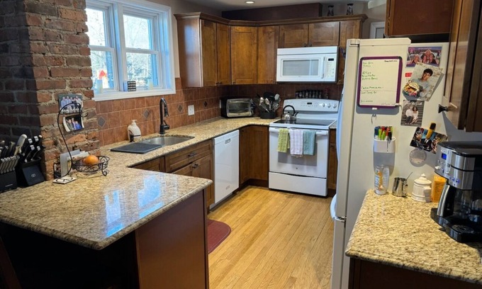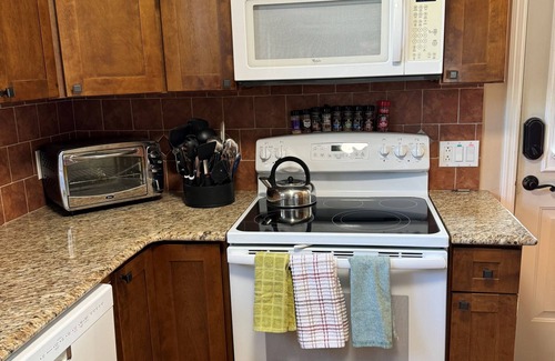 The entire first floor flat is yours. Kitchen granite countertops, cold filtered water and ice maker, all sorts of cooking tools, toaster oven and a clean microwave. Dishwasher and Cuisinart Coffee Maker for single cup or a pot of coffee. Outside the kitchen is a brand new deck with weber grill right off the kitchen. Parking for 5 plus cars. Shoot basketballs in the driveway, relax in the private backyard with picnic table. Back inside your bedroom has a comfy 10" thick mattress plus topper right next to your 2020 renovated bathroom with glass door shower and tiled bench seat. Relax under awesome water pressure shower. Pub height dining table easily sits 6 when you have guests. Living room has 55" QLED Flat screen with plenty of streaming apps. Plenty of recliners to relax in as well. NOTE: The Yard, Basement Laundry and Back Porch / Deck are common areas. From time to time owner may pass through these areas to use the exterior stairs for access to the 2nd floor or the basement storage area. None of these areas require access to your living space. Your entire interior living space is completely locked and private.