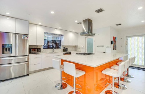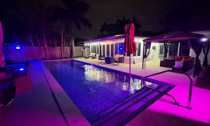 This tropical waterfront home is just 1 mile from Fort Lauderdale Airport and 22 miles from Miami Airport. The beach is a quick 10-minute drive, and the Hard Rock Casino is only 7 minutes away. Perfect for up to 6 guests, it features 2 king beds and a king-size sofa bed. Enjoy a 40-ft pool, pool table, ping pong, fire pit, outdoor dining, and 6 patio beds. Living room includes 3 recliners. Boat and jet ski not included.