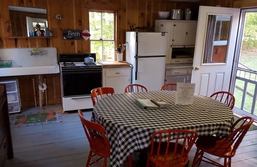 Staying at the Finch Camp is a throwback to earlier times, with delicious fresh spring water provided via an antique hand-pumped well in front of the camp and clean running water from a deep well servicing the sinks and shower inside. It has a large country kitchen with a gas oven/stove. The large living room has an oversized fireplace and a nice heating system that does a great job warming the camp in the spring and fall. (We close up the camp in the winter.) We also keep an acoustic guitar at the camp and several sing-along song books, plus plenty of games and puzzles and DVD movies. The large wraparound porch includes a three burner propane BBQ grill and a relaxing screened area if the bugs come out.