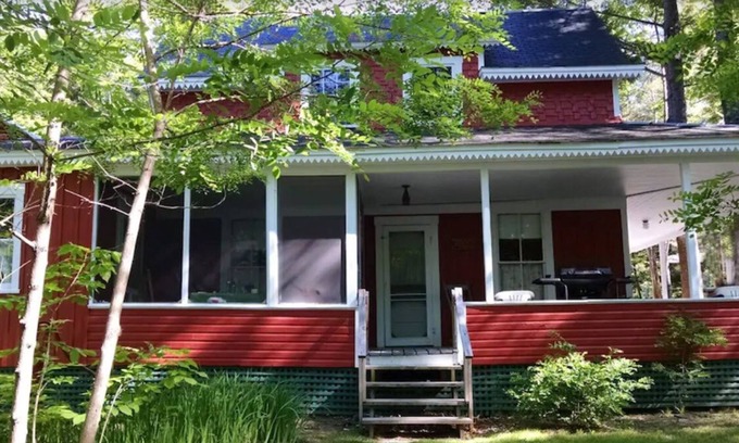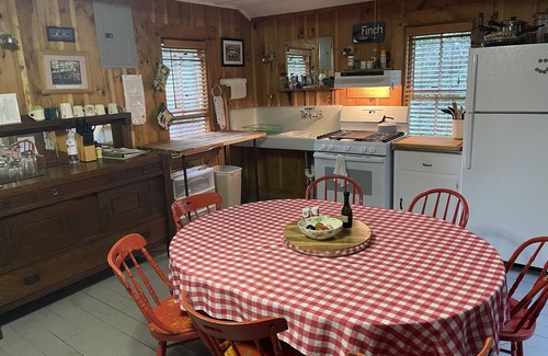 The two-story cottage was the first to be built on Lake Hebron more than 100 years ago, and has been updated to add modern comforts, including wi-fi and strong cell service, while still retaining its rustic charm. The cabin has peekaboo lake views through the trees and our neighboring camp and is just steps away from our dock on Lake Hebron. Our private dock area is located in a shaded grassy clearing nestled among the trees that is "catty corner" to our camp, with two Old Town kayaks and a 15 foot Old Town canoe that guests may use to explore the magical Lake Hebron. There are also plenty of lawn chairs, relaxing chaise lounges and a cedar picnic table as well as a stone fire pit at our dock area. The dock is perfect for swimming, fishing, or mooring your own watercraft.