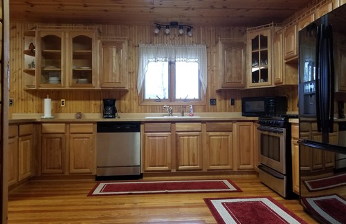 The walk out lower level has a family room with a large screen tv, a large reclining sectional, a separate room with a pool table and Foosball table and separate laundry room. The main level up the stairs has a living room with a reclining sectional & tv. The dining area has a table that seats 7 and there is additional seating in the kitchen. The kitchen has a dishwasher, microwave, and comes fully stocked with dishes, utensils, cookware, mixing bowls, coffee maker, toaster, griddle, waffle iron, George Foreman grill, crock pot, and bake ware. There are 3 bedrooms on the main level with brand new Restonic firm Queen Mattresses and Box springs: The master has a king bed and tv with full master bathroom attached. Bedroom 2 & 3 are large and set up the same with 2 queen beds with dressers in each. Main level bathroom has a tub shower combo and a double sink. The 24'x24' loft area could be used as a fourth bedroom and has a king size bed and 2 queen beds. (it has a tv that only runs a dvd/vcr combo with a small selection of videos available.) There are no bunk beds in this cabin. All rooms except kitchen and bathrooms have ceiling fans. Off the main level there are 2 decks. The deck off the kitchen is 14'x18' and the deck off the living room is 12'x18'. There is patio seating for 14 and 4 tables, plenty of room to enjoy outdoor eating. There is a charcoal grill available for use. Bonfire area available to enjoy evenings around the fire. There is lots of outdoor space for kids to run around in.