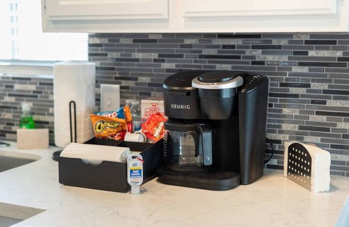 - FULL KITCHEN STOCKED WITH ALL ESSENTIALS, FROM COFFEE TO COOKWARE
