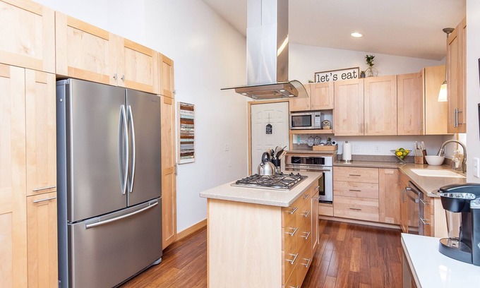 Enjoy 3 floors of space in this home with fresh paint, new carpet, and new furniture. Main floor boasts a kitchen and dining area. Upper floor has 3 queen bedrooms all with TVs, and a full bathroom. The lower level has an additional queen bedroom, family space, large rec room, full bathroom and down 5 more stairs is a fully equipped laundry room. Inside you can enjoy WIFI, TV, books, puzzles, games, foosball table and exercise bike. There are 3 steps in to the home.