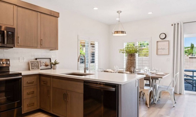- Fully Equipped Kitchen: The modern kitchen is stocked with all necessary cooking essentials, allowing you and your group to gather for meals and celebrations without leaving the comfort of your beautiful accommodation.