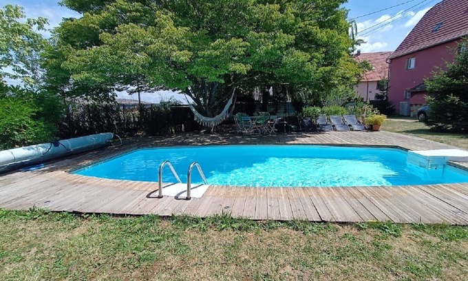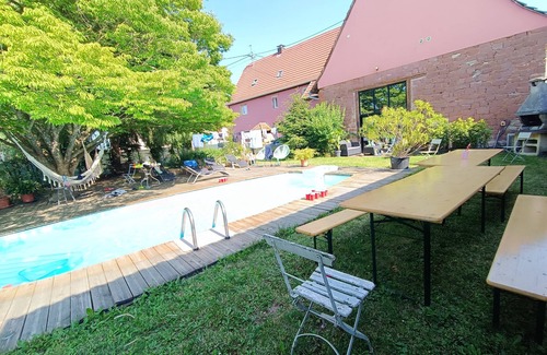 This accommodation is not accessible to people with reduced mobility. It is self-catering, sheets and towels are included in the price. it can be attached to nearby accommodation for up to 12 people located 30 minutes from Strasbourg access via the A4 motorway 10 minutes Strasbourg Entzheim airport 25 minutes Visit Strasbourg 30 minutes with the Christmas market, the cathedral, the European Parliament, the wine route is only 20 minutes for the first vineyards, the cabaret Royal Palace 20 minutes, you can relax in the swimming pool from June to September, you can reserve one or more tennis courts less than 10 minutes from the house, there is a petanque area for amateurs and a playground for the very young near the house, a cycle path along the Marne au Rhin canal 300m away to cycle to Strasbourg if you feel like it, pets are not allowed. The swimming pool is open from June to September depending on the weather.