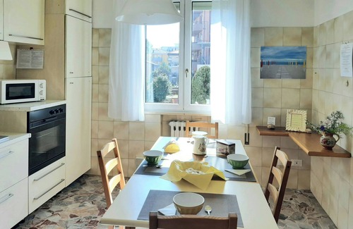 The apartment is located in a quiet, one-way tree-lined street, in one of the most popular and central residential areas of Rimini, next to the beautiful park 'XXV Aprile'. It is on the second floor of a building consisting of six apartments, with a shared garden; it has a reserved and free parking space, in a fenced communal courtyard behind the house; it also has a free garage for any motorcycles and bicycles. Furthermore, there is the possibility to park freely also along the street in front of the house.