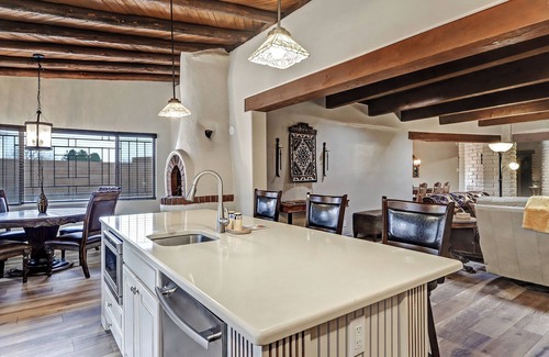 Welcome to this charming adobe house in Albuquerque near Old Town and the Rio Grande Nature Center. This spacious 3,300sq ft property boasts 4 bedrooms, including 2 king beds, 1 bunk bed, and 2 queen beds. There are 4 bathrooms equipped with hair dryers and showers. The home has a gourmet kitchen and butler's pantry. Guests will feel right at home enjoying WiFi, smart TVs, heating and cooling, gas fireplace and a washer and dryer. The back yard opens onto an acequia and walking trails. There are bikes in the garage for your use. Book now and enjoy everything this house has to offer.