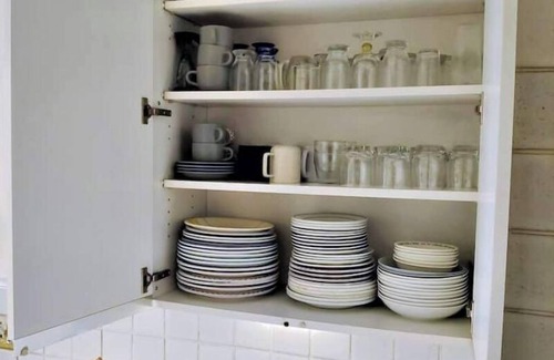 The kitchen is equipped with induction hobs, an oven, a dishwasher, a blender, a toaster, a large fridge, plenty of crockery, a double sink, kettle and coffee maker. A washing machine is also installed there.