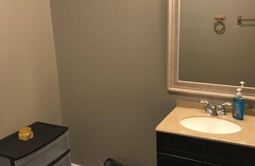 Spacious basement apt in metro Atlanta area, oversized living room area, bedroom, bathroom, bar area/dining, and gym room. Bedroom has a queen and twin bed. Living room area has a futon and 2 couches, tv, and personal desk.
