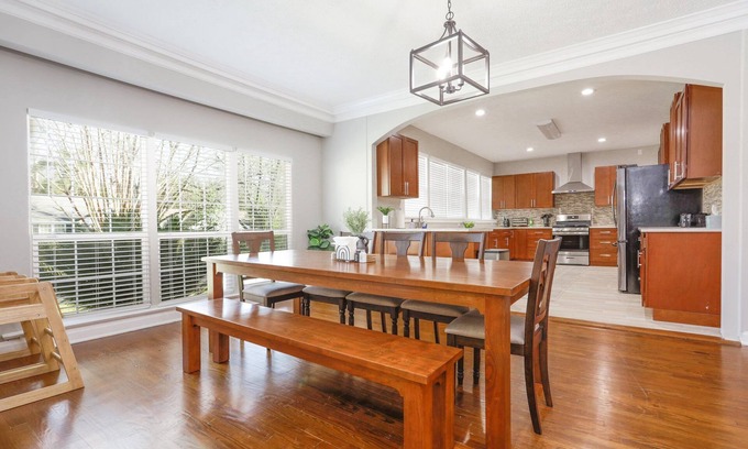 This beautiful house features two separate living areas, each equipped with 4K smart TVs, ensuring entertainment for all guests. The expansive open-style kitchen is perfect for catering or preparing a pre-wedding brunch, while the formal dining room boasting an 8-foot table provides a sophisticated setting for intimate dinner receptions. With six bedrooms—five of which include 4K smart TVs—and five full bathrooms, everyone will have ample space to relax and unwind. The fully fenced-in backyard offers a private outdoor area that can be transformed into a picturesque ceremony site or reception space, adding to the romantic allure of your wedding day.