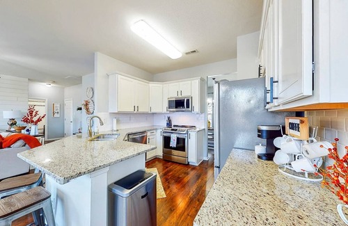 KITCHEN: Fully equipped, stainless steel appliances, microwave, electric range, refrigerator with water/ice, cooking basics & spices, Keurig coffee maker, toaster, kitchen table seats 6 and breakfast nook for 4, kitchen island seats 4.
