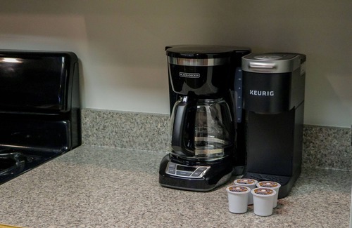 The kitchen is well prepared for anything you might throw at, with all needed appliances. We provide coffee grounds and some pods for the Keurig, though this is just to get you started.