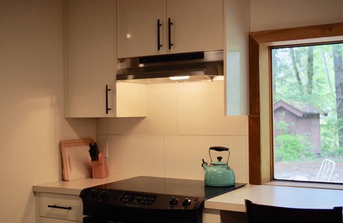 The kitchen comes complete with a full fridge with freezer (including ice cube trays), full electrical stove and oven, microwave, dishwasher, and wine cooler. You can choose to sit at the counter and look out the large window, or sit at the dining room table at the far end of the kitchen. Smaller appliances include coffee pot, coffee grinder, toaster, toaster oven, and slow cooker. Pots, pans, and vast cooking utensils provided.