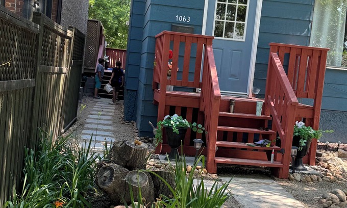 This unique and comfortably furnished 1913 home has 3 stories with plenty of outside decks & balconies. The entry level hosts a full kitchen, dinning room, living room, bathroom, with two main entries, plus patio doors off the dinning room to the back deck. The front of the house has unheated porch with some shelves. (This porch storage is also used by the host)