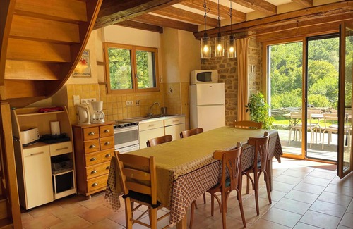 The cottage has been fitted out in the outbuildings of a magnificent 17th century Logis, ideally located, very quiet property, comfortable, tasteful decoration, 2 terraces of 30 m2, fully renovated, hilly landscape with stream below, in full nature.