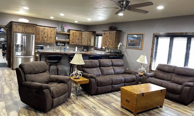 The living room has a couch, love seat and recliner along with another Smart TV to allow for streaming via your mobile phone hotspot.