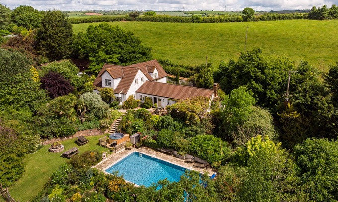 Secluded country house in Devon. Beautiful views and garden. Covered pizza oven area. Large outdoor pool heated in summer (Can be heated out of season by arrangement with an additional charge) Fire pit. Outside Barbecue area. Floodlit table tennis. Large Wood Fired Scandinavian Hot Tub. Large convivial kitchen with Aga, gas hob and pyrolytic electric oven. Flood lit hammock deck. Wood burner in large sitting room. Local pubs in walking distance serve excellent food. Large games cellar room with snooker, darts and "bar". Fenced small children's play area with mud kitchen and children's play house. Peaceful country walks.