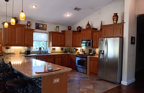 Large open-plan gives the feeling of spacious elegance. Living room is beautifully decorated with huge leather sectional that will fit the whole family! The fireplace (gas) with instant "on switch" gives immediate ambience on those chilly evenings.