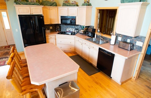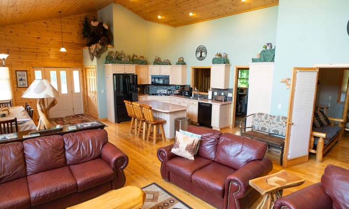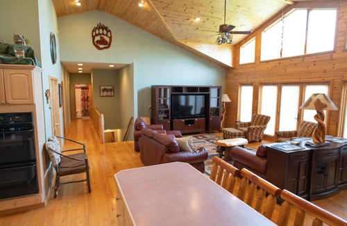 The large, open great room is perfect for family gatherings. A second kitchen, living room and dining room downstairs, plus a den off the main living area provide lots of space for privacy, even for multiple families. You'll love the open, airy feel and rustic decor throughout. Lots of knotty pine and hardwood floors.