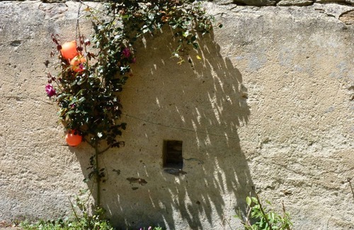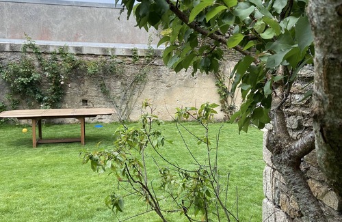 secure garden walled stone walls, facing south with large table, fruit trees, outdoor games