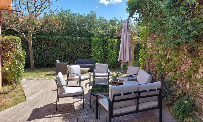 Outdoor shower, barbecue - Not overlooked, quiet, overlooking the pedestrian walkway - Patio interior glazed roof - Wooden terrace of 60m2 - Garden closed and trees - Two parking spaces in front of the house, large parking at 60m - 300m from the city center , 300m from the Port. - Ten minutes: shopping centers and airport. All seaside activities and activities in a radius of 10km. Very touristy hinterland.