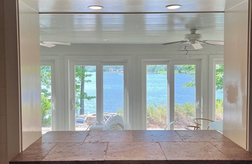 This recently renovated 5-bedroom, 3-bathroom lakefront home with a spacious top deck, large patio, and dock access sits on a private point with over 300 feet of shoreline, offering panoramic water views, peaceful surroundings, and room to comfortably sleep up to 12 guests.
