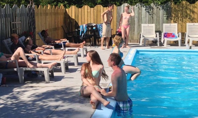 Rentals are only for your listed amount of people in the VRBO rental agreement. Due to the cottage property being high occupancy At No time is any non-listed/non-registered/non-paid people allowed to visit or set foot on the property, in the cottage, in the pool area, fire pit area etc. As required by the fire inspector, town by-law’s & our insurance policy all unregistered trespassing people will be removed from the property and the rental cancelled with no refunds. Your private rental is for the entire Cottage (with No one else on the large property) 7 bedrooms’ total, the upper, lower & suite. Beautiful Seasonal (open late Spring/Summer/Fall) In-ground Heated 33' x 18 'x 57" deep pool (30% of length is shallow end at 36" deep) or short walk to beaches. Air-conditioned, BBQ, Free WIFI, Free internet, large fire-pit, lots of space & located right in Grand Bend. There are no other charges if after departure the cottage is clean, no items missing & no damage. Absolutely No pets allowed. No smoking allowed in buildings. 7 bedrooms, 3 bathrooms plus 1 at the pool, 3 kitchens, 3 natural gas BBQ's, 3 patio decks, large fire-pit area with seating & your own (open late Spring/Summer/Fall) large private 33' x 18 'x 57" deep heated in ground pool with lounge chairs (open late Spring/Summer/Fall). Cottage is located on Highway 21 South in the town of Grand Bend on 2 acres of land 1 mile from the main street. Located along the rotary nature trail/side walk. The largest piece of rental property in Grand Bend with lots of room for you. Everybody walks down the trail to the main street so you do not have to pay for car parking. Lots of on-site parking. Great family gathering spot for summer vacation. From the Cottage you are a 20-minute walk to: Grand Bends Main Street Strip with Shops & Bars. Walk to Grand Bends Main Beach with Kids Splash Pad, Boardwalk, Fishing, Jet Ski Rentals & Boat Rentals. 5 to 10-minute drive to Oakwood Golf & Spa Resort, Huron Country Playhouse, Grand Bend Motorplex, Pinery Flea Market, Pinery Provincial Park & Lambton County Heritage Museum. A little further to the Starlight Drive Inn Theater, Sand Hills Golf, Indian Hills Golf and Multiple Beach's. First Upper and Second Lower units have 3 bedrooms, 1 bathroom each with tub and shower, living area, dining area and complete modern kitchen (equipped with dishes, cutlery, pots and pans and cleaning supplies). Each section its own outdoor deck complete with patio furniture and natural gas BBQ. Outdoor private in-ground heated swimming pool onsite (open late Spring/Summer/Fall). Upper has: Bedroom 1 (Queen Bed), Bedroom 2 (Queen Bed), Bedroom 3 (Queen Bed), and Bed sofa in living room. Lower has: Bedroom 1 (King bed), Bedroom 2 (Queen Bed), Bedroom 3 (twin bed plus double bed), and Bed sofa in living room. En-suite has: Bedroom 1 (King bed) & Futon bed sofa. First Unit 369 Ontario Street Upper Level. The upper is 1032 square feet. Hardwood floors throughout with ceramic tiled kitchen/bathroom. 42-inch cable television in living room. Living room has an expansive picture window overlooking the front yard providing a bright and airy feeling. Off the living room is a fully equipped kitchen that contains full size fridge, stove, dishwasher, microwave, coffee makers, oven and plenty of cupboard and counter space. There is a dining table indoors and another private dining area is available on your own private backyard pool view patio. There are three bedrooms decorated in lovely soft earth colors. Each room has a Queen Size bed, dresser, and closet. Windows and patio doors provide a pool view from the kitchen and one bedroom. The other two bedrooms have a front yard view. Full modern bathroom with tub and shower. Central heating & conditioning upstairs. Enjoy the convenience of free high-speed internet connection. A front load washer and drier is included for your use. The lower is 1032 square feet. Enjoy everything the above section has to offer. Ceramic tiled floors throughout with in floor heating. Spacious three bedrooms (1 Massive King Bed, 1 Queen Bed, 1 Single & Double Shared Room). Dressers and closets are in each room. Full kitchen with oven, stove top, fridge, microwave oven, coffee maker and lots of cabinet space. Comes fully equipped with everything you will need for cooking and eating. Connecting to the kitchen is a large dining table. Alternatively, if you prefer the outdoors there is a large table outside on the lower patio. Full bathroom with bath/shower. Lots of room and storage space. Individual controlled ductless A/C heating & cooling units in each room. Also has in floor heating. Upper suite Hardwood floors throughout with ceramic tiled kitchen/bathroom. The suite includes its own private entrance and there is an adjoining door to upper unit. Large bedroom with king size bed, 42" flat screen television, DVD player and high speed internet. There is a kitchenette kitchen table for two with microwave, bar fridge, coffee maker and toaster oven. Bathroom is a half bath with shower (no bathtub). Central air conditioning throughout this unit as well as a ductless heating & cooling unit in the bedroom. Large upper patio with gas barbeque and 2 dining tables.