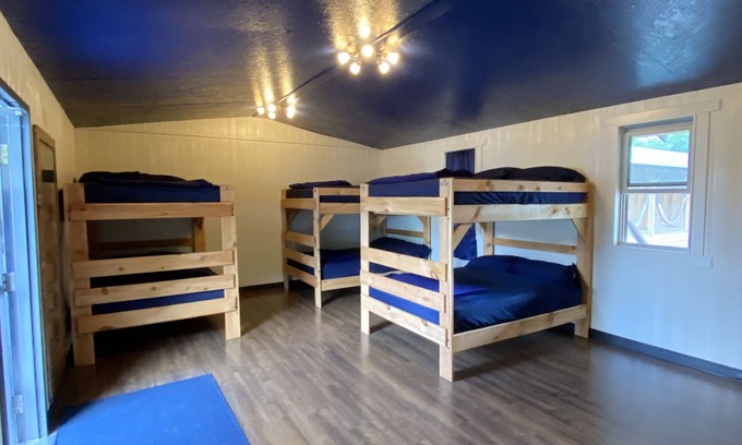 3 full-sized bunk beds (6 beds total), with a private sitting area with futon, vaulted ceiling, common area with couches, hammocks on front deck. Linens, towels and shower supplies included.