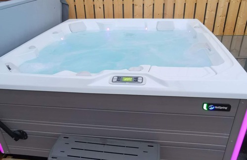Outside: Terrace with 6-seat Hotspring®️ spa, tables and chairs and gas barbecue.