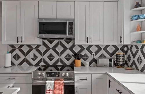The open kitchen includes the usual appliances (dishwasher, overn, Refrigertator...) plus a Ninja coffee maker that makes hot and iced coffee as well as cold brew. Plates, cooking utensils, pots and pans can be found in the cabinets as well.
