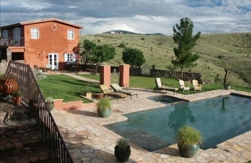Mas Souleido is a bit of luxury living located in Fort Davis, Texas. A 2 story guest house nestled at the foot of Blue Mountain on 20 acres. Serene and quiet luxury for a long weekend or longer getaway. Dark skies, balcony, expansive views. 2 upstairs bedrooms both with private bathrooms and soaking tubs, king bedroom (can be made into twins) also has daybed. Antique spiral staircase, downstairs, 2 bedrooms 1 queen and 1 with 2 twins (can be made into king), shared bath with shower, and large loft with 3 twin mattresses, and a half bath. The loft overlooks a large gameroom with pool table, bar area with ice machine and a limestone -carved fireplace. A large porch overlooks a grassy outdoor playing area. Also there is a gravel patio with fire pit. Kitchen and laundry area, Dish tv. Dining area seats 8, living area with television, library corner, board games. 40 foot outdoor pool, hot tub, propane gas grill, patio with umbrella table and chairs.