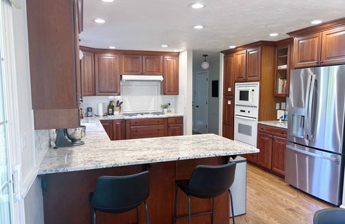 Your family will be close to everything when you stay at this centrally-located house. This home is close to shopping, dining, public transport, & tucked away in a quite safe neighborhood. Perfect for any family/friend gathering! Fully stocked large kitchen, living room & family room. 4 bedrooms, 2.5 bathrooms, Covered Patio, with additional seating outside around the firepit.