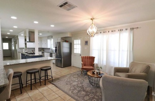 Located just 4 minutes from the interstate in a quiet and safe neighborhood, easily access the property with a self check-in keypad before pulling into your private 2-car garage. Your family will enjoy plenty of space and fun activities. The Chef-style kitchen includes a 5-burner gas cooktop, double oven, large refrigerator, coffee pot, microwave and plenty of cookware and dishes for those big dinners. A cozy sitting area is located near the kitchen for a comfy conversation over coffee or tea. The formal dining room boasts a sophisticated dining table that comfortably seats 10.