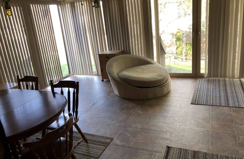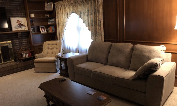 This is family oriented, private, beautiful brick home located three blocks from historic 3rd Street and 291 highway. Two bedrooms (king size bed, double bed, two twin beds) and two (full and 3/4) bathrooms are on the main floor. Patio room has a futon sofa. The additional floor includes two bedrooms (double and twin bed) and a full bathroom (when included) but is an EXTRA booking..