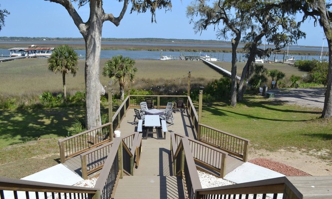 Large riverfront home with one of the BEST views on the GA Coast from the massive deck overlooking the Medway River. Walk a few steps to the Sunbury Crab Company Restaurant next door for great seafood and steaks. 35 min south of Historic Downtown Savannah. Within a 75 min drive to beaches of St Simons Island, Jekyll Island and Tybee Island.