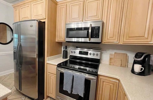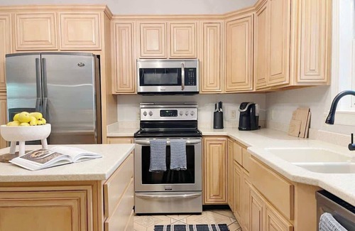 On the second level, you will have three bedrooms, one full bathroom with a double vanity, and a den with a 65" smart TV to entertain guests of all ages. Two of the bedrooms have two queen-sized beds each. The third, and largest bedroom, has two queen beds and a double bed. They are positioned in away that makes the room feel large and inviting - not congested at all!