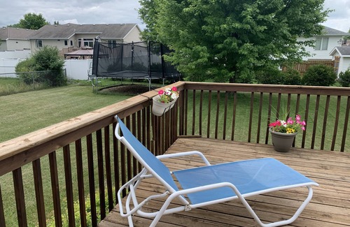 Ranch style house with 3 bedrooms and 2 baths. Close to grocery stores and schools. Quiet and safe neighborhood. Downstairs has queen beds in two of the bedrooms. Upstairs has queen bed. Deck and trampoline in back yard. All the amenities and washer and dryer and a grill.