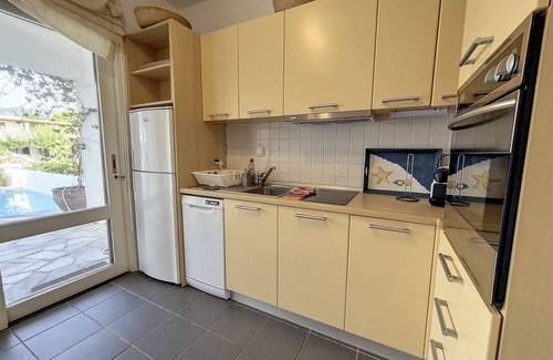 Located in Porto Hydra Village, a secured gated community built around a canal network, with private villas settled along a vast sandy beach of the Saronic Gulf in the surroundings of Ermioni (Peloponnese), this renovated villa consists of two independent apartments with separate access, and is characterized by a 5,5 x 3,5 meters swimming pool (open from late April to late November), two beautiful shaded balconies (one with partial sea view, one with canal and swimming pool view) and one shaded terrace next to the swimming pool.