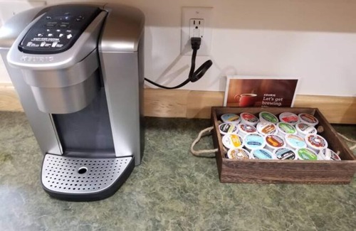 - Large, well-stocked kitchen with Keurig coffee maker and stainless steel appliances.