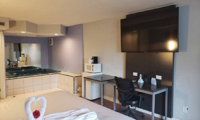 This Smoking Suite with 1 King Bed features a large Jetted tub, Free WiFi, Free parking, a 65-inch flat-screen TV with HD cable channels for your entertainment. For your comfort, this room is equipped with personal climate control, microwave, telephone, refrigerator, and complimentary toiletries. INCLUDED: Free WiFi, Free Breakfast, Free Parking NOT INCLUDED: Please note that pets are not allowed in any of our jetted tub or smoking suites.