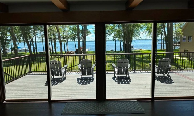 100 feet of north shore Shawano Lake frontage on spacious 1 acre lot, shallow water around entire dock area which is mostly sandy, occasionally little seaweed. Large home with two levels of living and entertainment space, ideal for multiple families. Floor to ceiling windows open to breathtaking lake views throughout the home. Just 30 minutes from Green Bay where you can enjoy one of Wisconsin’s largest inland lakes with multiple sandbars, great fishing, swimming and water activities. Access many bars/restaurants via the water or by short drive. Half mile from Shawano County Park with large sandy beach, playground, snack shop, and boat launch. Close to casino's, golf courses, bowling, outdoor movie theater, brewery, downtown shops, and much more! 10% Discount for 7 night stay. Max 16 adults.