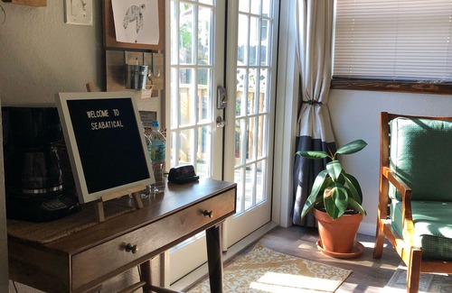 Located minutes from the beach in an established neighborhood in North Palm, we offer a spacious room with a king sized bed and comfortable living area. While it is attached to our home, we have created a private entrance with a key pad, private walk and parking just for you. There is no kitchen. We have a mini fridge, microwave and coffee pot.