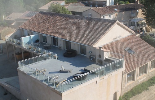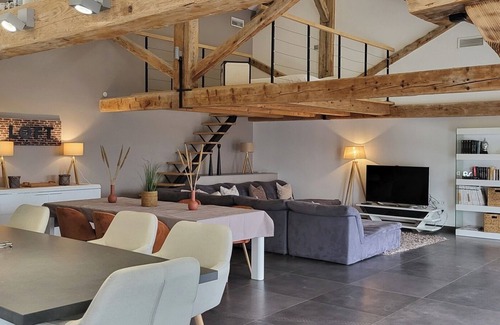 The loft upstairs, has been offering a 150m² terrace with private jacuzzi, views of the vineyards and the river. A summer kitchen and a wood oven are available on the terrace. Large living kitchen with mezzanine, 2 CH with adjoining SE and SB, 2 beds 140 and 1 bed 160. Clim reversible, sheets and towels provided.