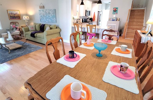 On the main level of the home, you'll find comfort & fun & plenty of space to stretch out. You'll appreciate the tankless water heater, the real red oak flooring, the soft close wht kitchen cabinetry, the lrg dbl-door stainless-steel refrigerator, all the quirky art finds, our tiny kitchen library, the open-concept living/dining/kitchen area & the private paver stone patio just outside the kitchen where you can sit outside to enjoy a meal.