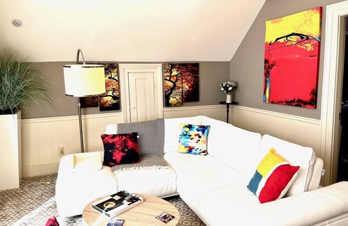 Nestled on the second floor of a quaint 1870s brick Victorian cottage, (right across the street from the Marathon Center for the Performing Arts) this one-bedroom apartment was, until recently, an interior design studio displaying high-end furniture and appliances. You can now enjoy this luxurious space containing an Italian queen-size bed, white Italian leather sectional sofa and arm chairs in the living room, a kitchen outfitted with a European combination washer/dryer (so you only have to load the laundry and it automatically washes and dries it with no further attention from you), Sub Zero compact refrigerator/freezer (plus another under-counter refrigerator), and electronic Kohler shower controls for a double, no step glass shower with dual shower heads and an additional hand-held shower head. Walk to restaurants, bars, coffee shops, shopping, post office, banks, and bakeries, because you are right downtown.